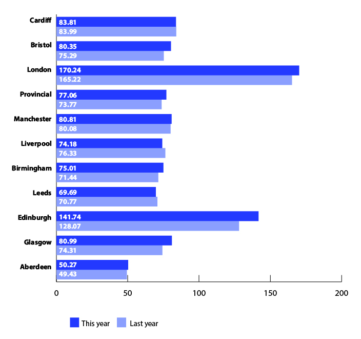 Bristol hotels have also performed consistently well over the past 12 months despite a slight dip in occupancy, with ADR at £109.44 and revpar at £80.35.