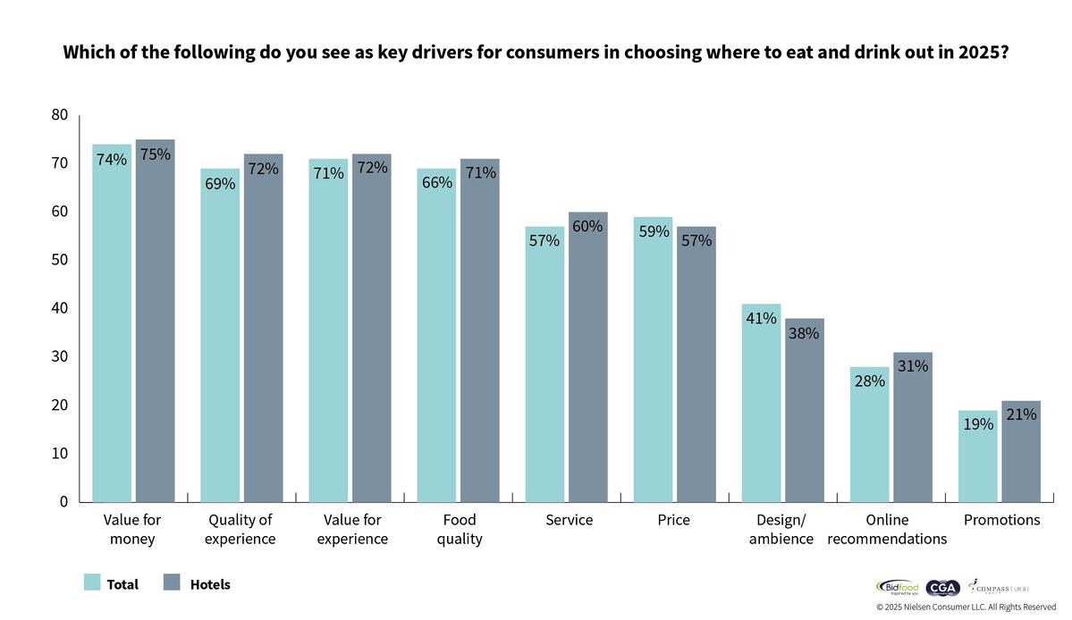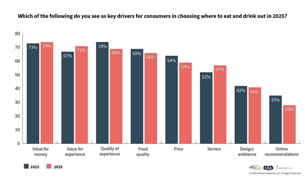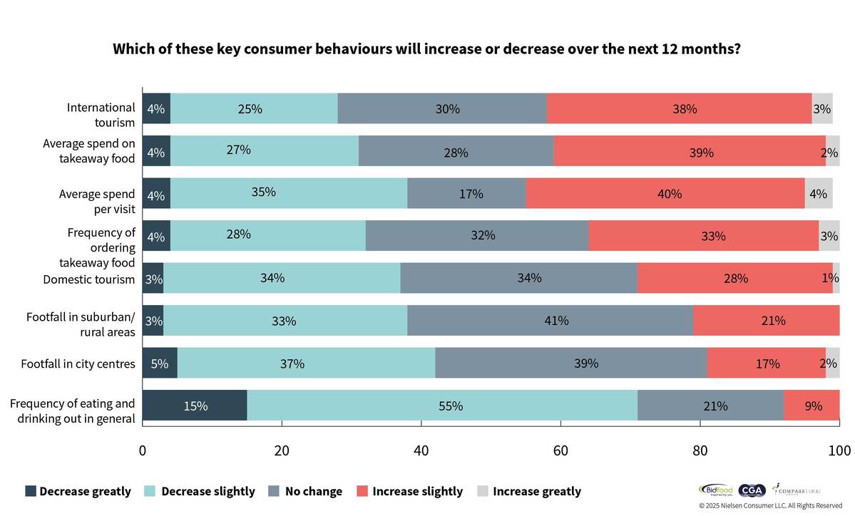 Business leaders responding to the Hospitality Business Leaders Survey 2025, produced by The Caterer and CGA by NIQ and sponsored by Bidfood and Compass Group, predicted a reduction in footfall in both urban and rural areas. The survey revealed that 71% expected the general frequency of eating out to decline, 42% expected city centre footfall to decrease and 38% anticipated footfall in suburban and rural areas to fall.