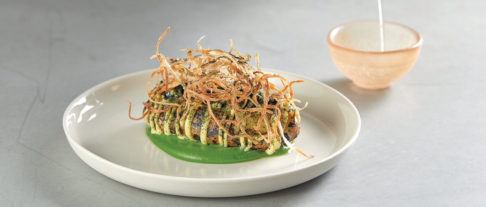 Signature dishes included a pink fir potato that was steamed before being brined in seaweed and then barbecued until crispy. It was sprayed with a Japanese smelt vinegar to give an umami flavour and plated on top of a smooth watercress and parsley sauce. The potato was then cut open and topped with confit shallots, seaweed caviar, a mayonnaise made from chickpeas, crispy shallots, and a powder made from wakame, salt and vinegar.