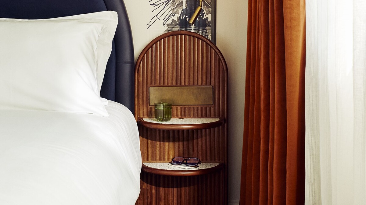 Hyde London City’s Headliner Suite is tucked away in the eaves of the building, offering five-metre high ceilings, a private marble-topped bar, and rooftop views of St Paul’s Cathedral.